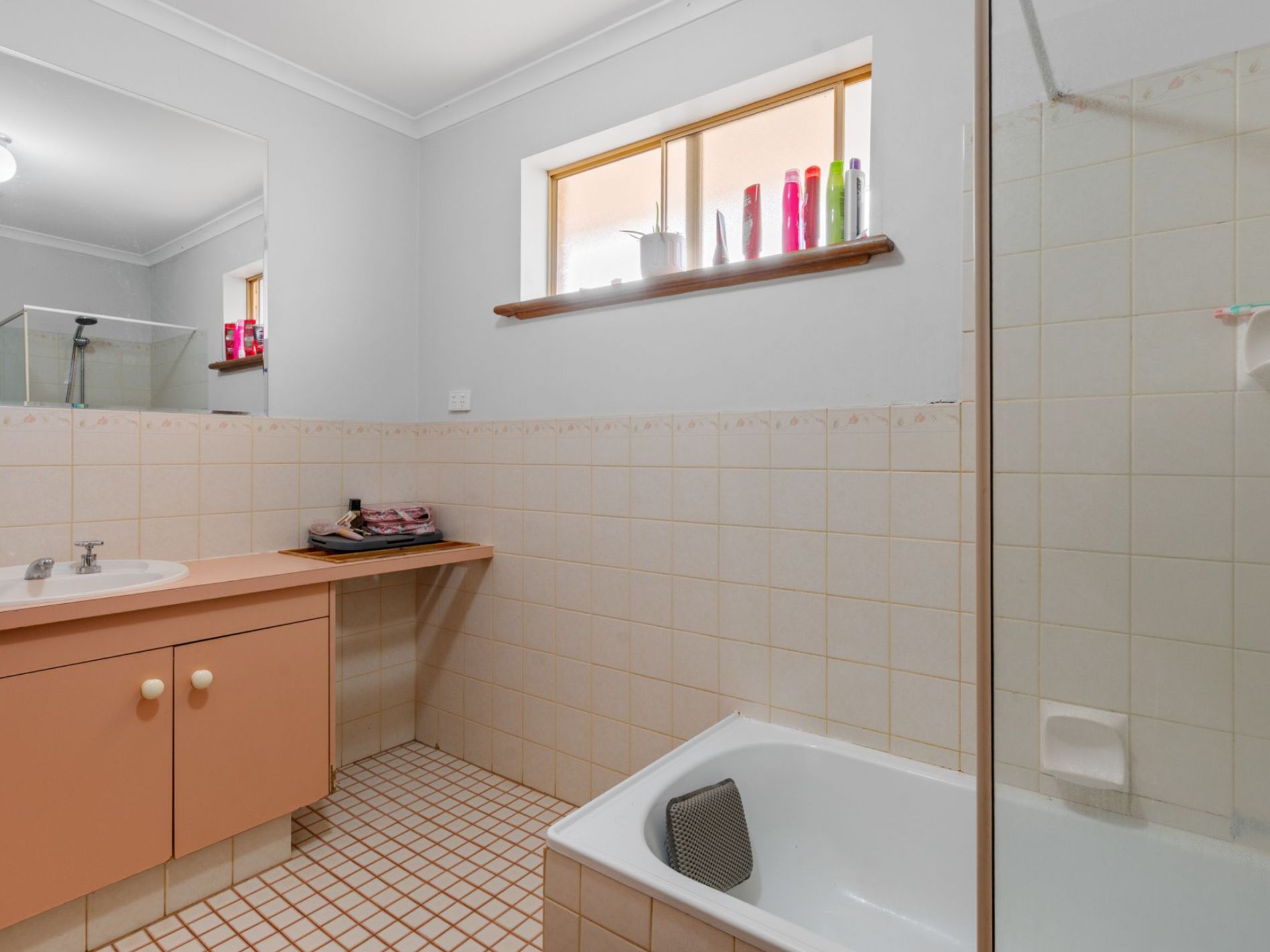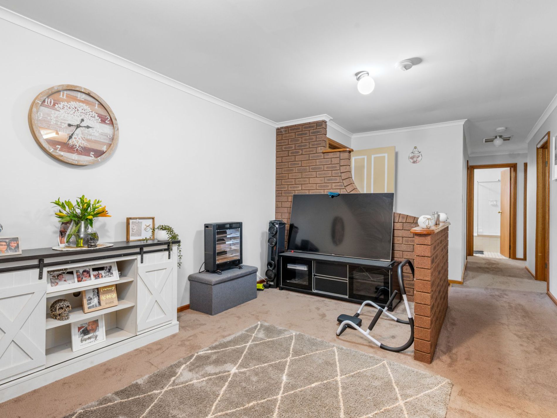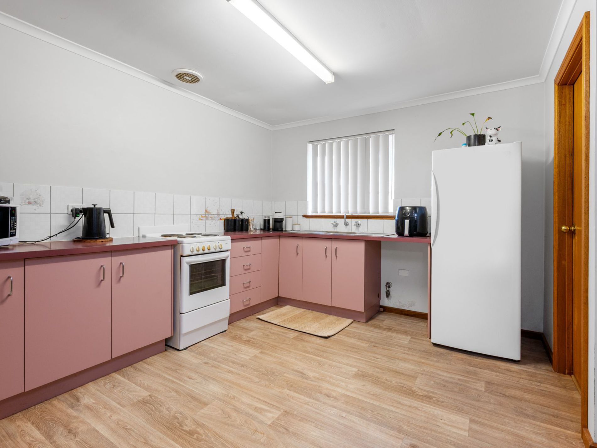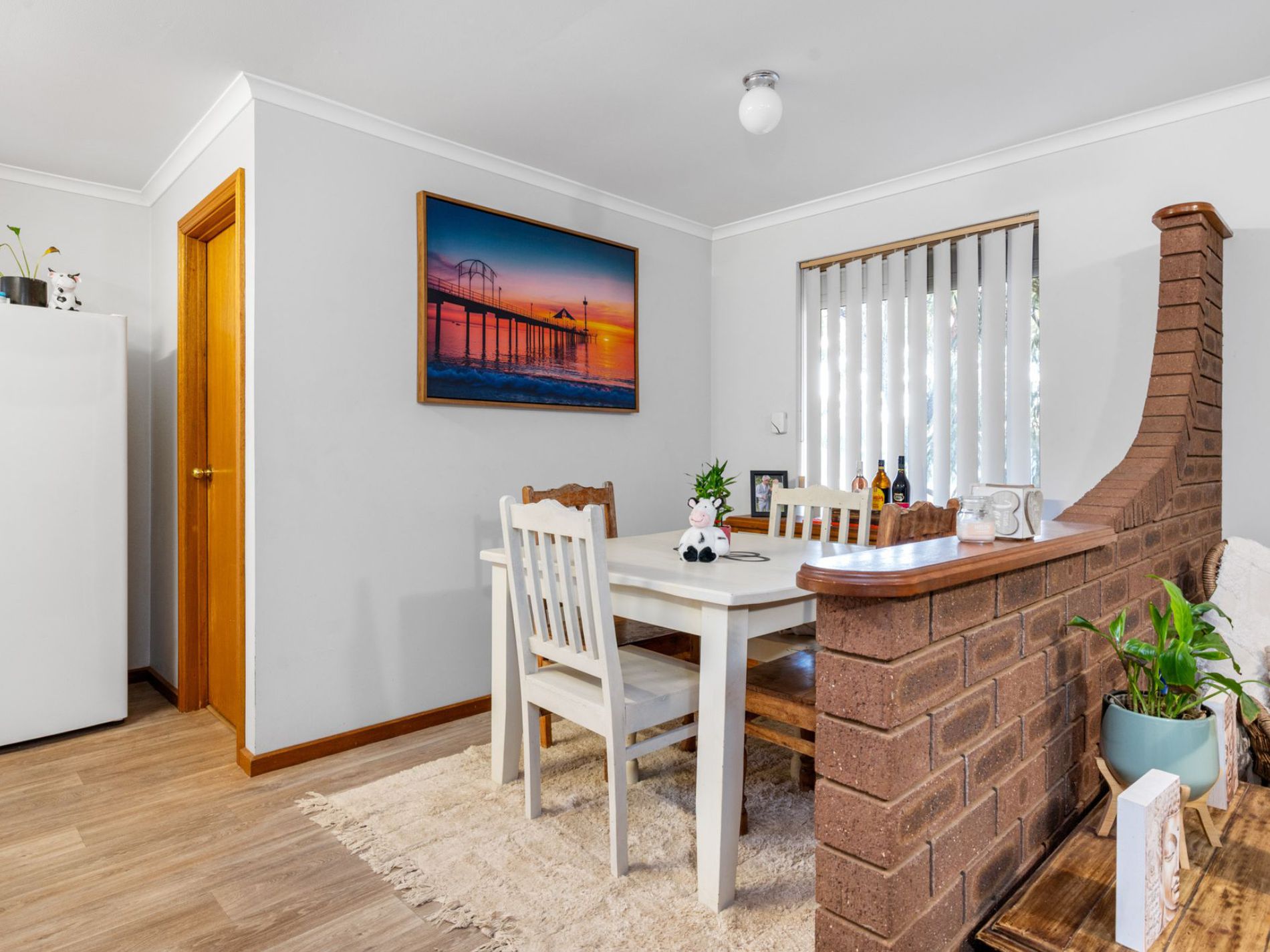 It features three good-sized bedrooms with built-in robes, a semi-ensuite with shower over bath, and a spacious open plan kitchen, dining and living area with relatively new vinyl flooring.