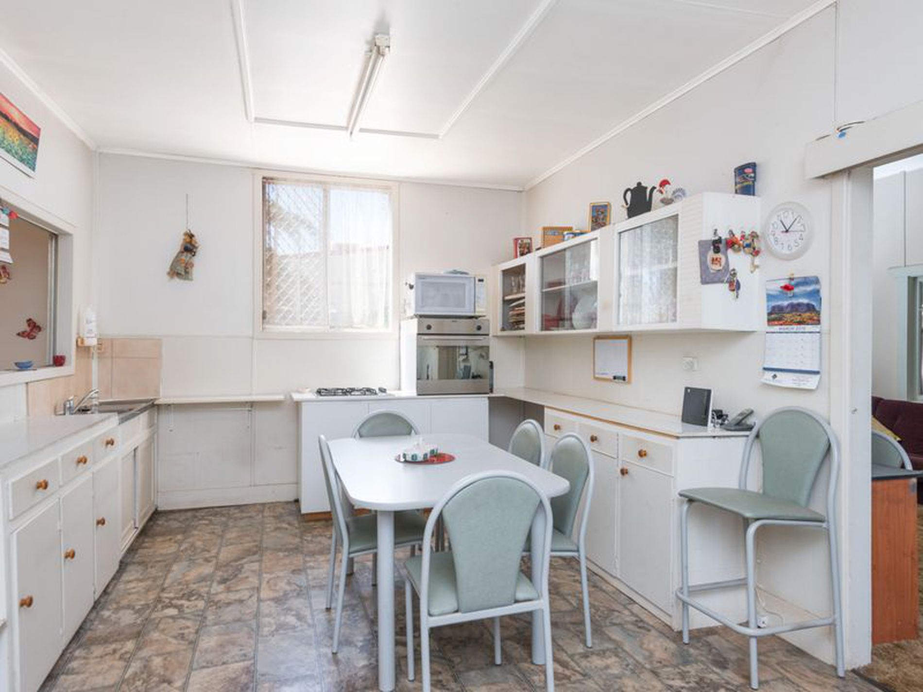 The kitchen overlooking the rear living area has good natural light and a tiled fireplace.
