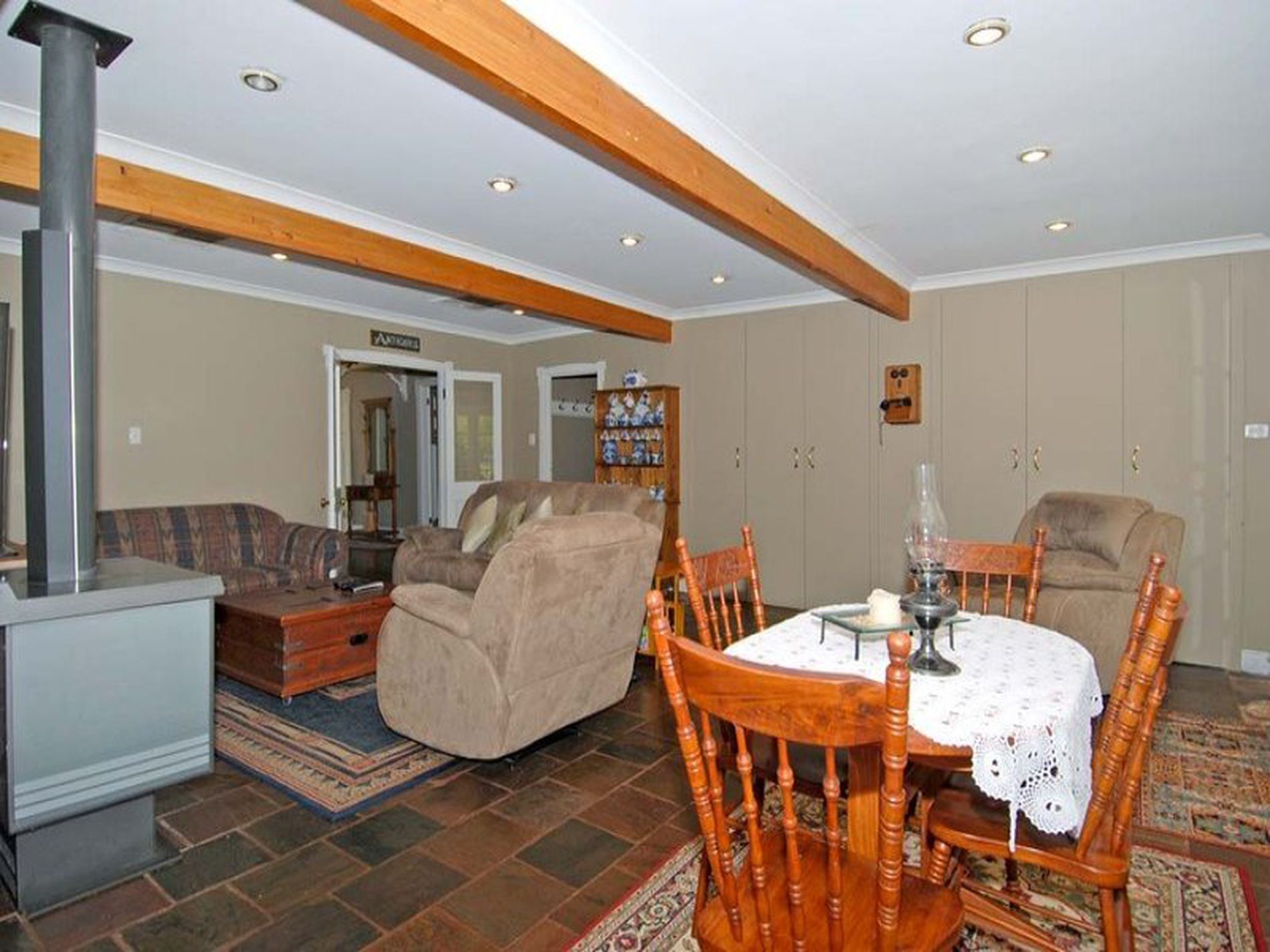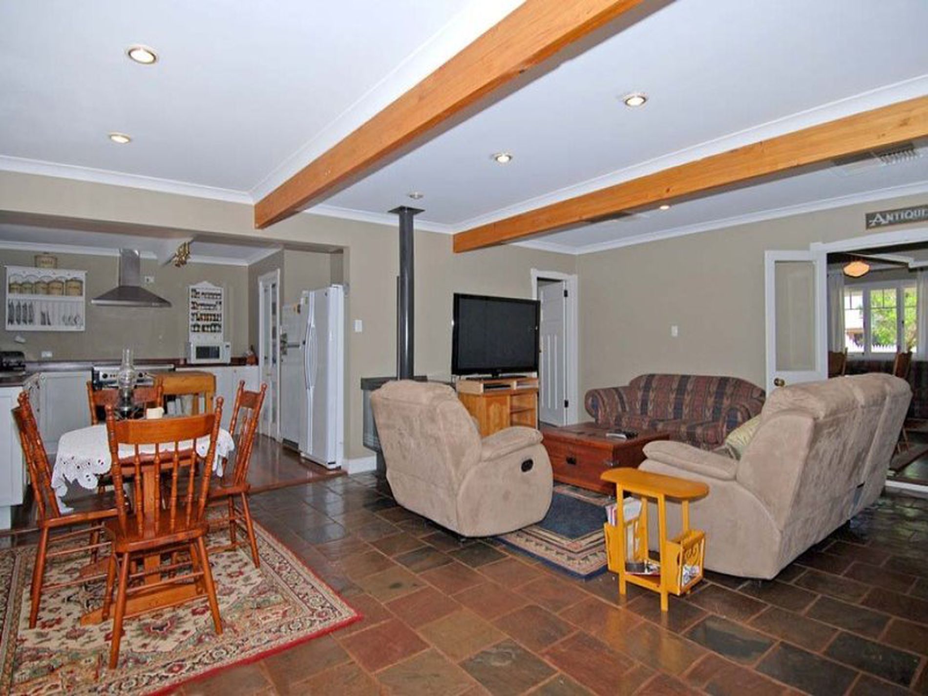 Lustrous polished boards flow through the home with polished slate tiling to the family room.