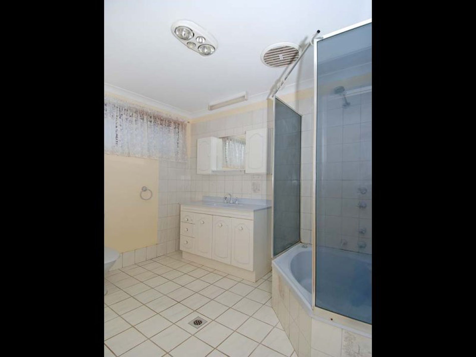 Large kitchen with ample cupboard space and modest bathroom.