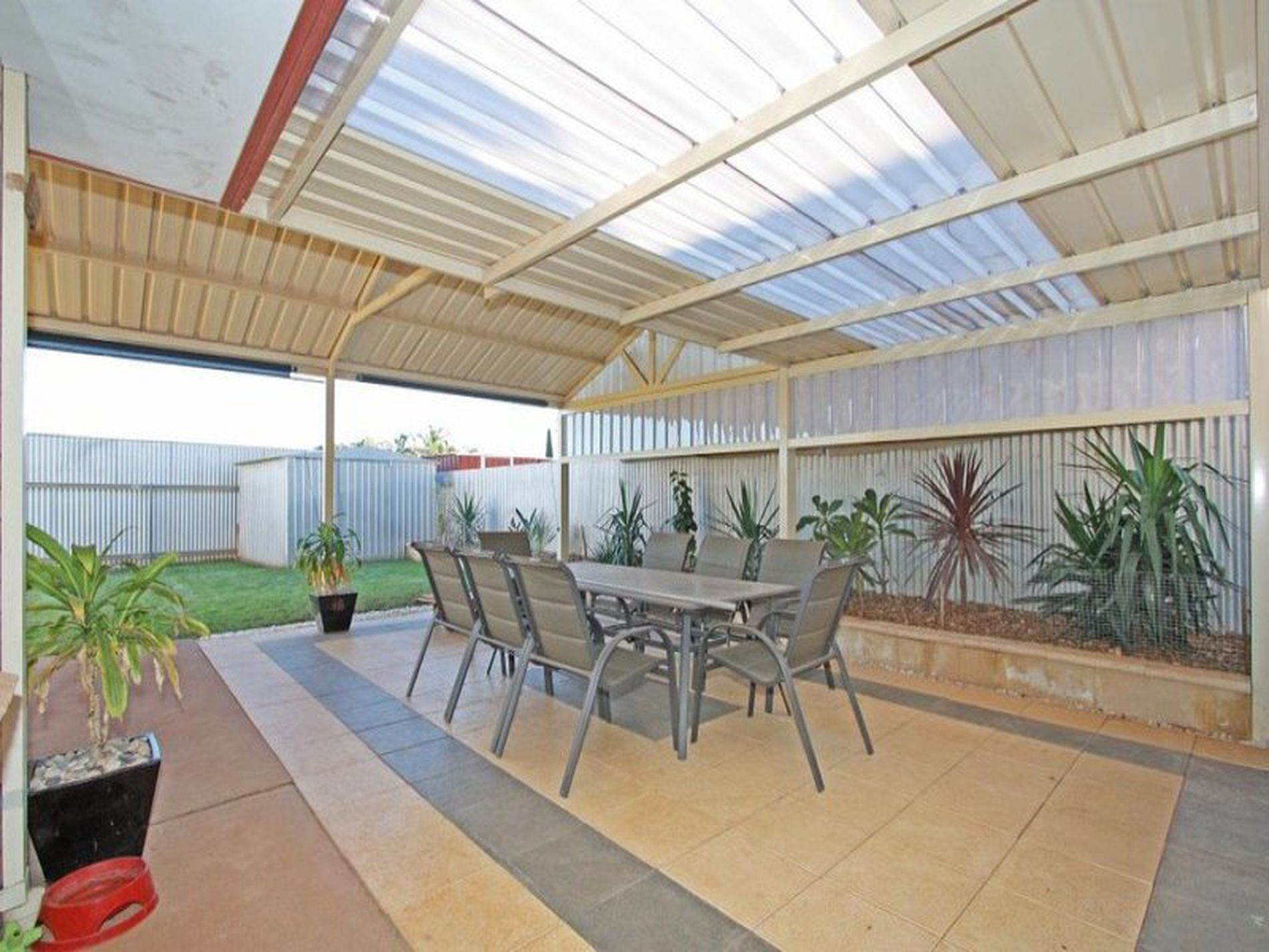 From the gabled patio you get a refreshing view over the fiberglass below ground pool and the reticulated established lawns and garden bed.