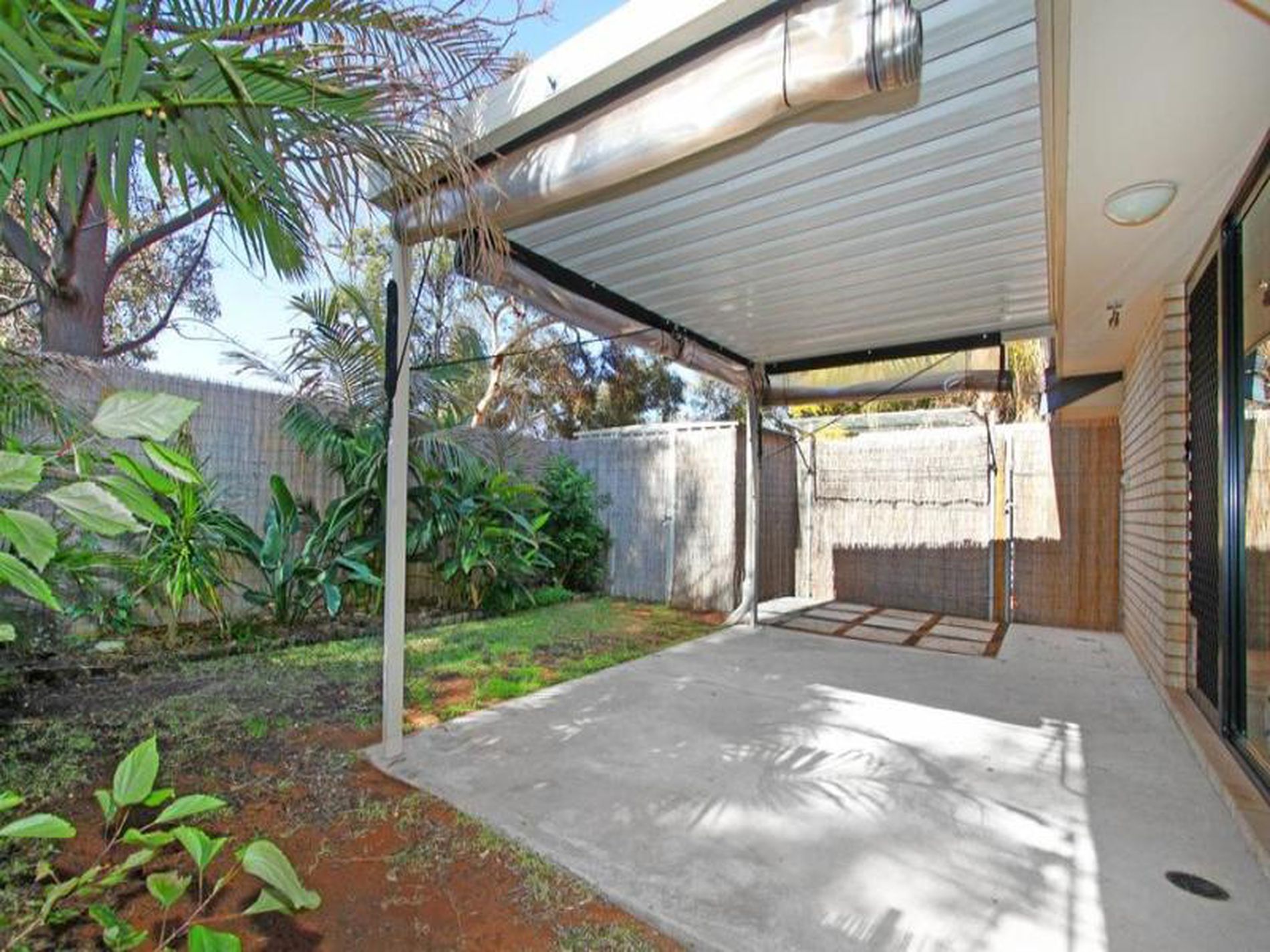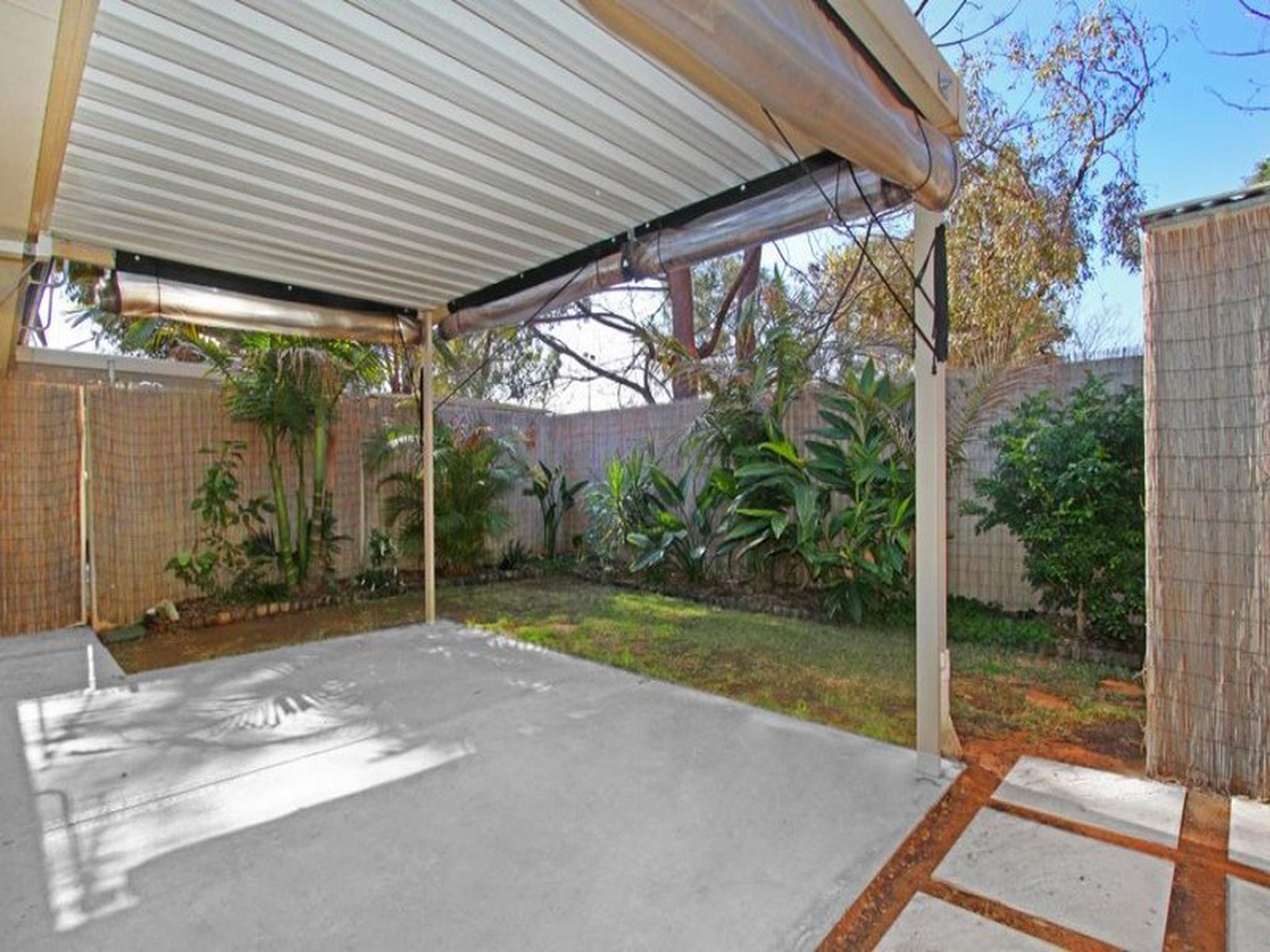 Kitchen, dining and living areas are open plan and from here through the larger sized sliding doors, you can see the patio surrounded by lush green palms, bamboo fencing and cafe blinds for all seasons.