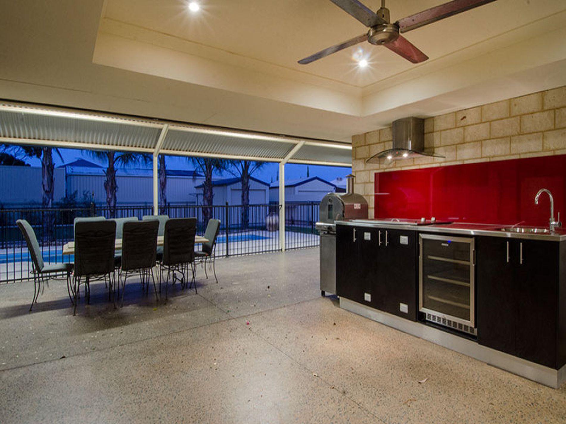 The outdoor entertaining space has been done with great imagination and thought. Polished concrete floors and divine expansive gabled patio add even more refinement to the property. Built-in gas BBQ, pizza oven and refrigerator as well as hand washing facilities and cupboards complete a very inviting summertime area for the whole family to enjoy.