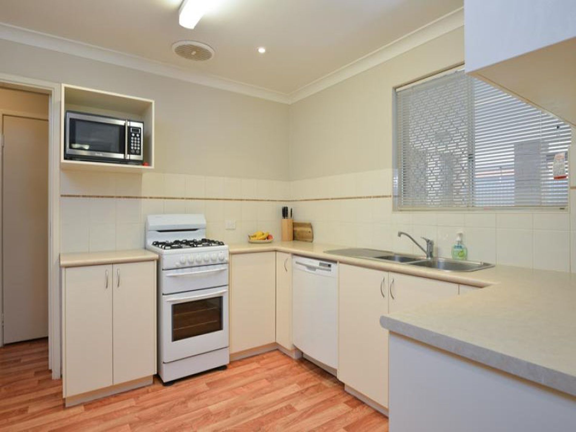 Modernised kitchen, meals with views out over the backyard