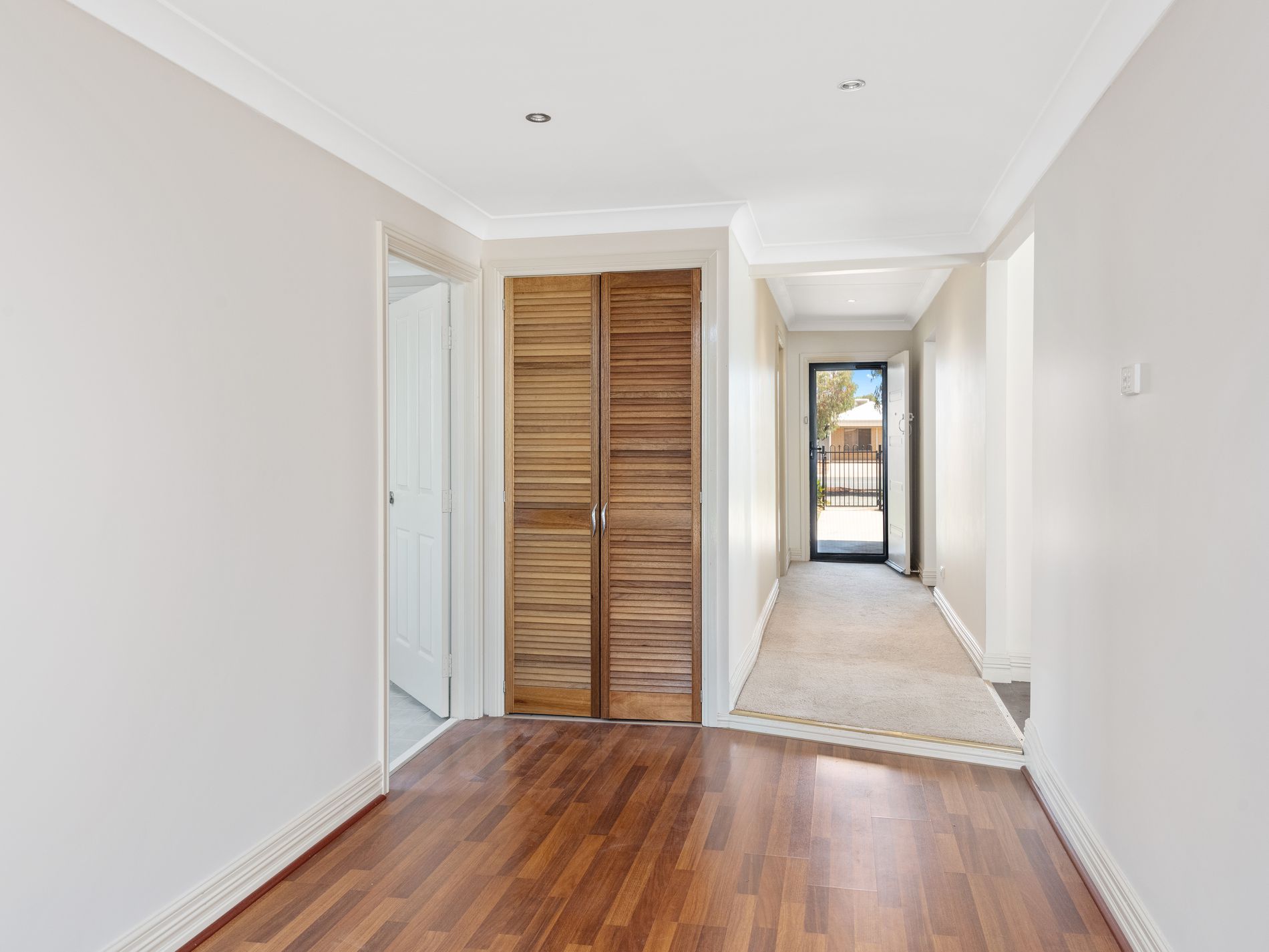 The good-sized master bedroom has his and her double built in robes and a ceiling fan. Convenient access from the master to the bathroom is possible as it is a semi-ensuite allowing you access from two doors.